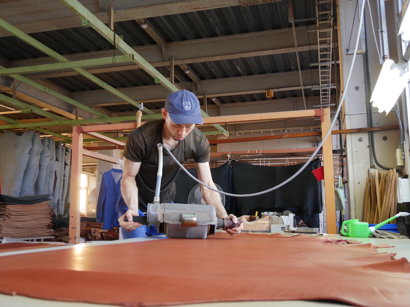 最初に配属されたのは、新入社員が必ず通る熱乾燥室。染色された革に一度セッターをかけて、そこから瞬時に乾燥させる。ヒーターをかけるから、室温は50度。うだるような暑さのなかでの作業はさすがにきつかった。