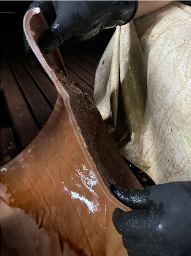 前回は、ミモザ100%で鞣した革を取り出すところまでを紹介しましたが、今回はその続きと、もうひとつの取り組みを紹介します。