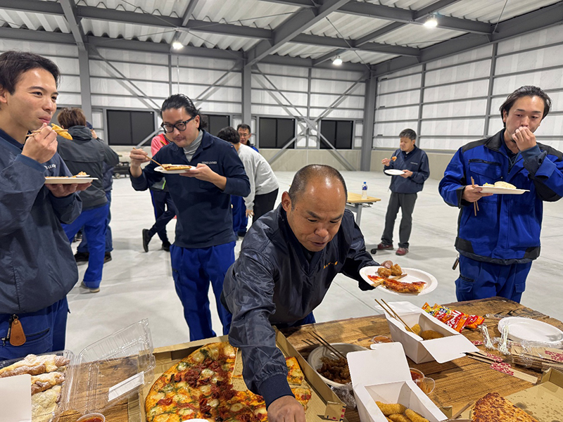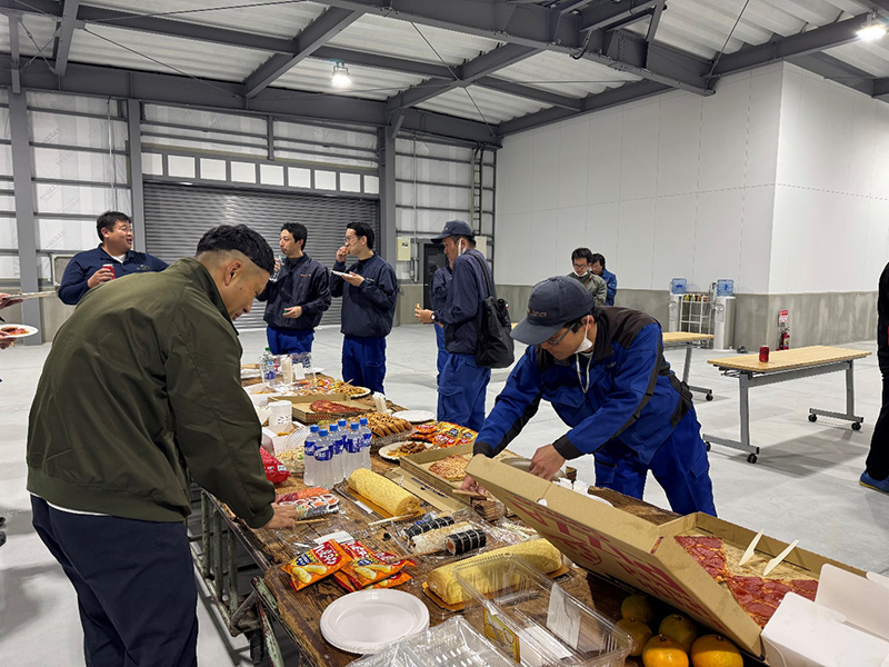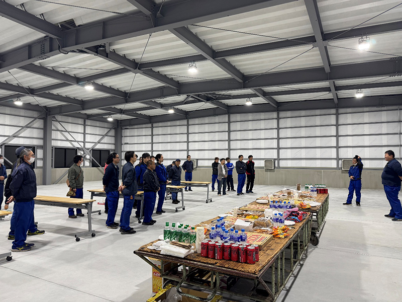 社員の皆さんは作業中にもかかわらず、私たちへの対応もとても丁寧で、作業後翌日の創業祭に向けて社員全員で会場準備を行っていました。
