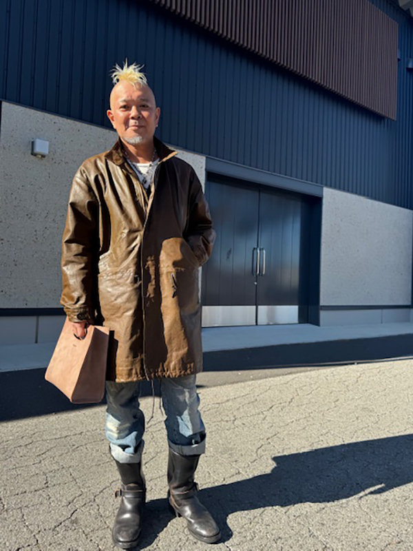 当社の “oiled kip” を使用したTENJIN WORKS のレザーコートを着用されていたので、