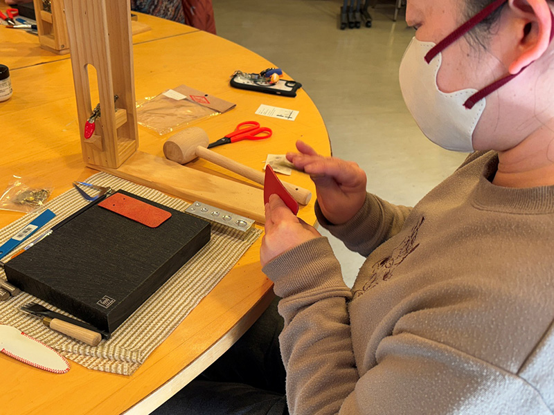 参加者の皆さまには裁断済みのキット状態から穴あけ、手縫い、金具の取付といった本格的な工程に挑戦していただきました。