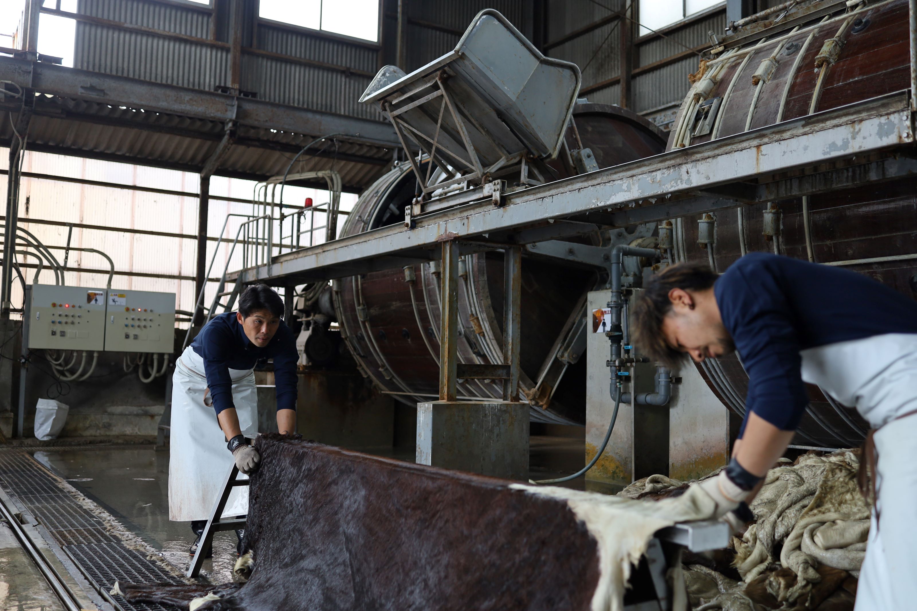 自分が扱う原皮は、排泄物もついていて血まみれ、虫がわいていることも。その状態の革をでっかいタイコに入れて、水洗いして引っ張り出す。水戻しが終わった革は、腕、足、尻尾もついている状態だから一番重たい。それを1枚、1枚広げながら、頭側なのか、お尻側なのか、前足なのか、後ろ足なのかを見つけだす。