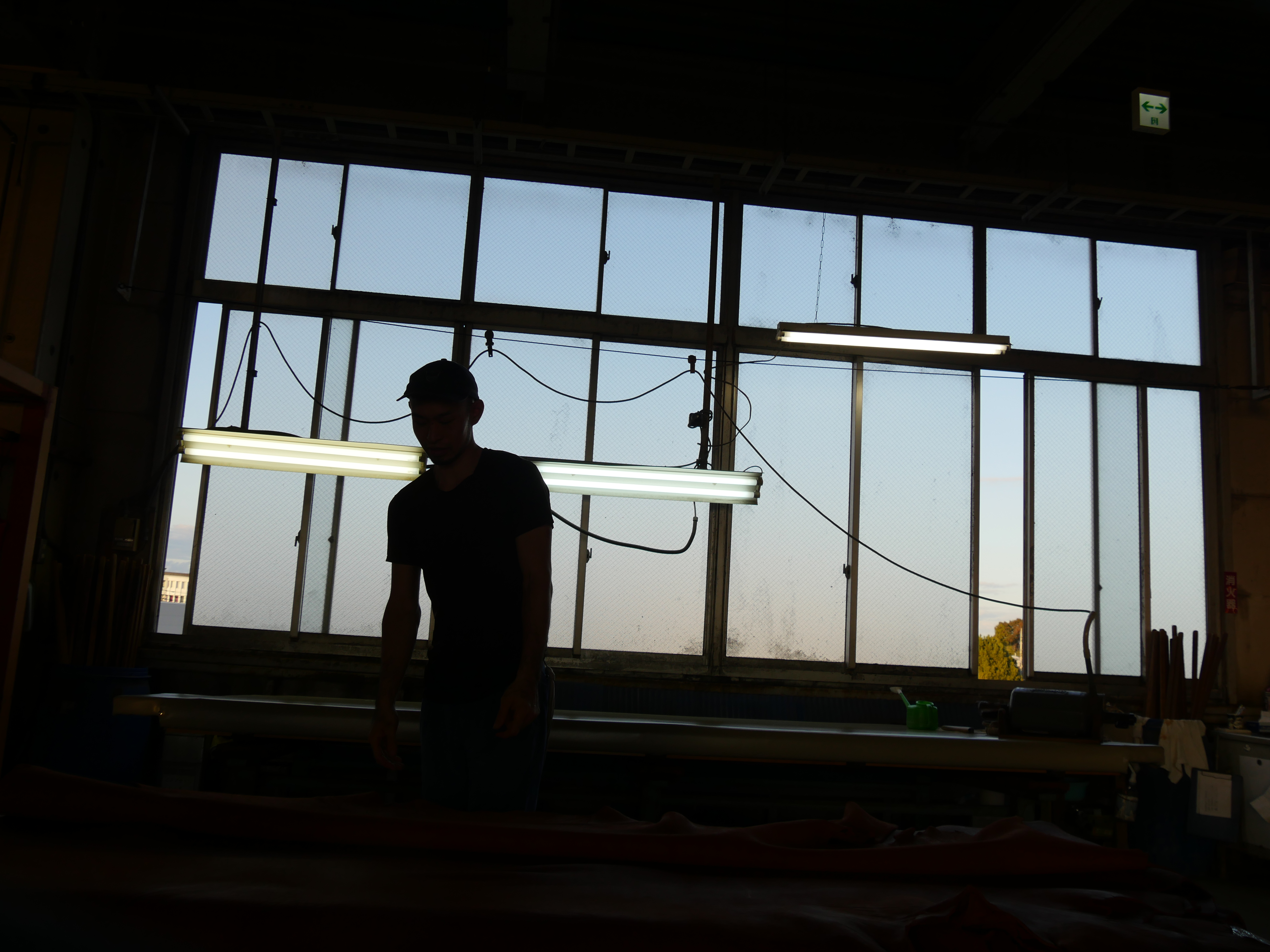 最初に配属されたのは、新入社員が必ず通る熱乾燥室。染色された革に一度セッターをかけて、そこから瞬時に乾燥させる。ヒーターをかけるから、室温は50度。うだるような暑さのなかでの作業はさすがにきつかった。