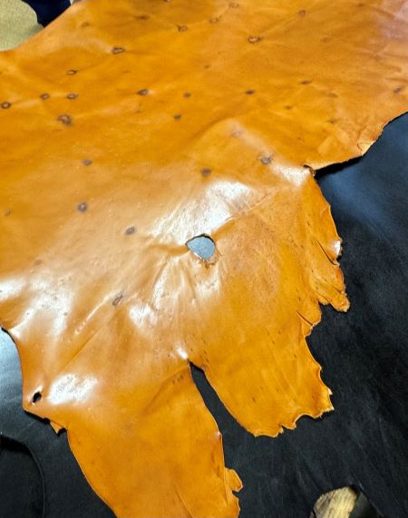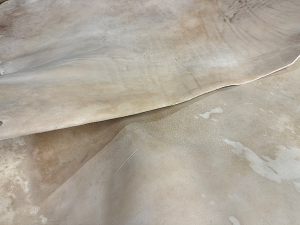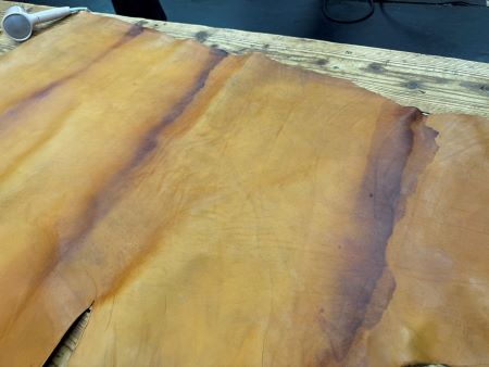 鞣した後加脂し、乾燥させた状態のヌメ革。