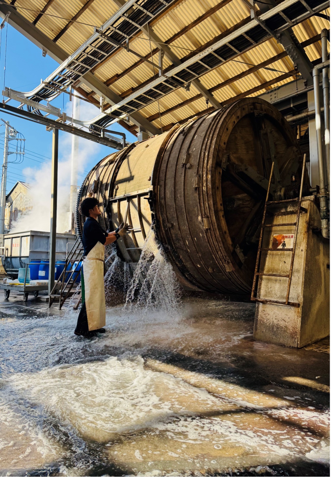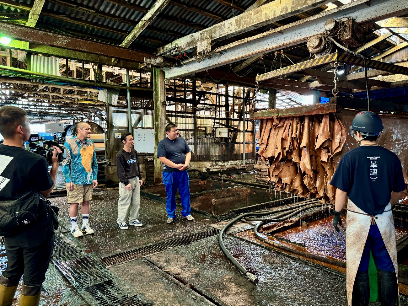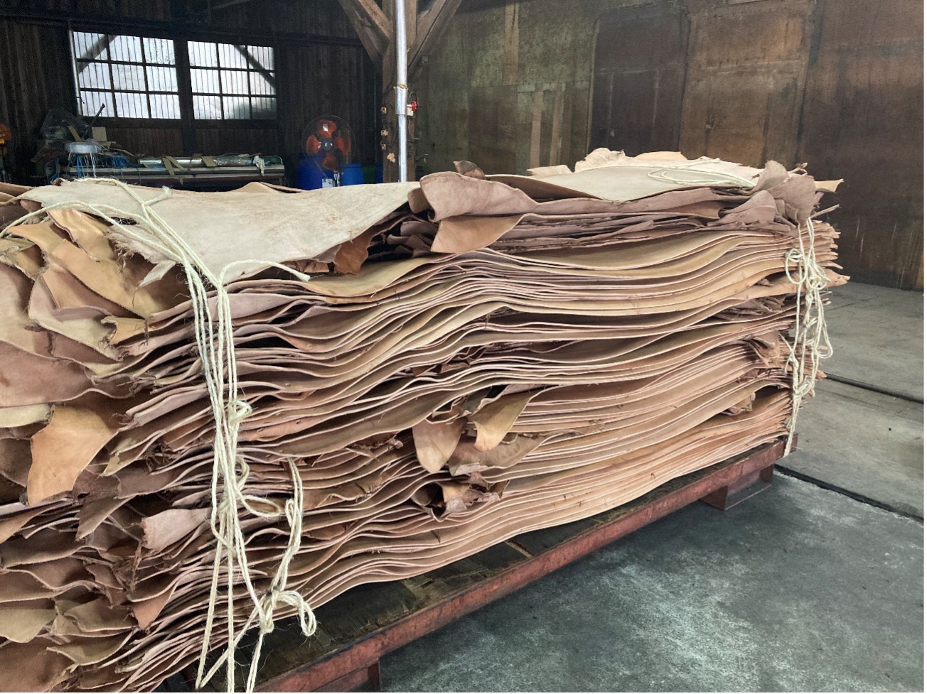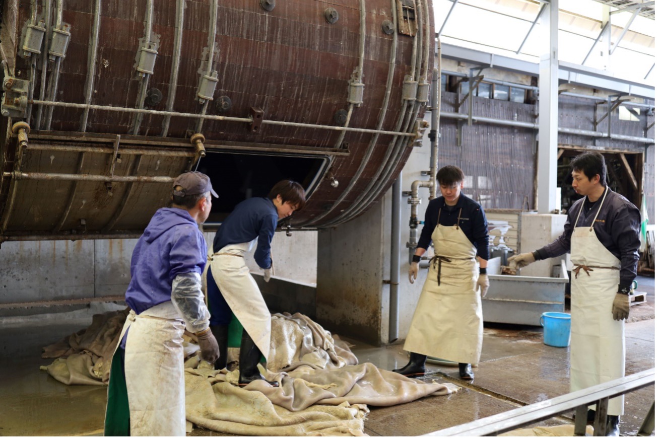 石灰は皮をふくらませて毛を溶かし、脱毛を促進させます。もちろん5日間放っておくわけではなく、濃い液槽から薄い液槽へと移動させます。硫化は微量ながらガスが出ているので、本来ガスマスク装着の検討も必要ですが、真夏は熱中症のリスクが高くなるので現状難しい状況です。作業している人はもちろん、何となく聞いただけでも相当手間と負担がかかっていることが想像できます。