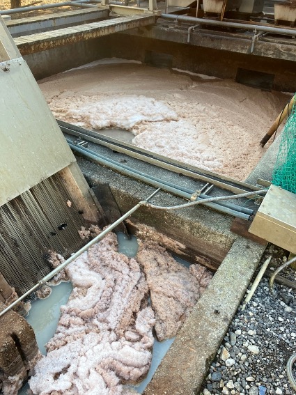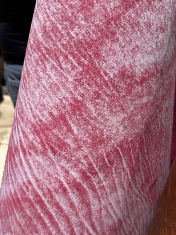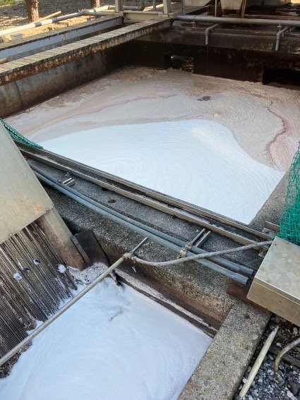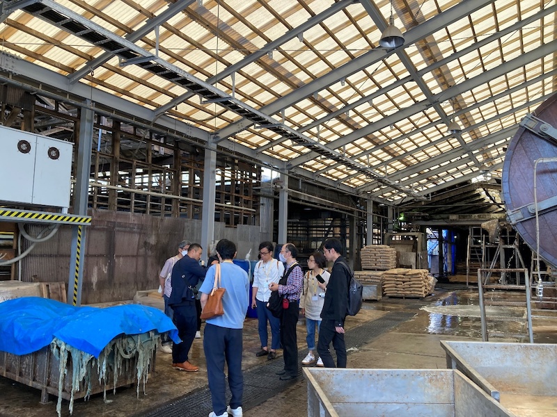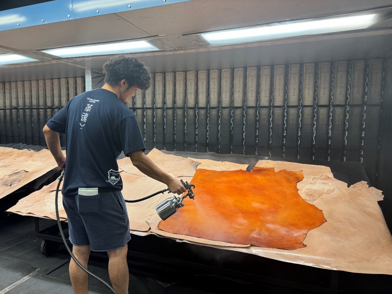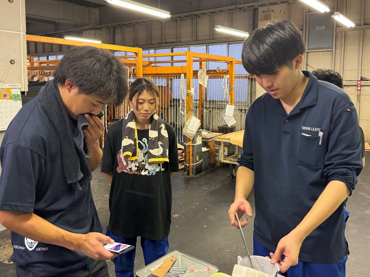 石灰は皮をふくらませて毛を溶かし、脱毛を促進させます。もちろん5日間放っておくわけではなく、濃い液槽から薄い液槽へと移動させます。硫化は微量ながらガスが出ているので、本来ガスマスク装着の検討も必要ですが、真夏は熱中症のリスクが高くなるので現状難しい状況です。作業している人はもちろん、何となく聞いただけでも相当手間と負担がかかっていることが想像できます。