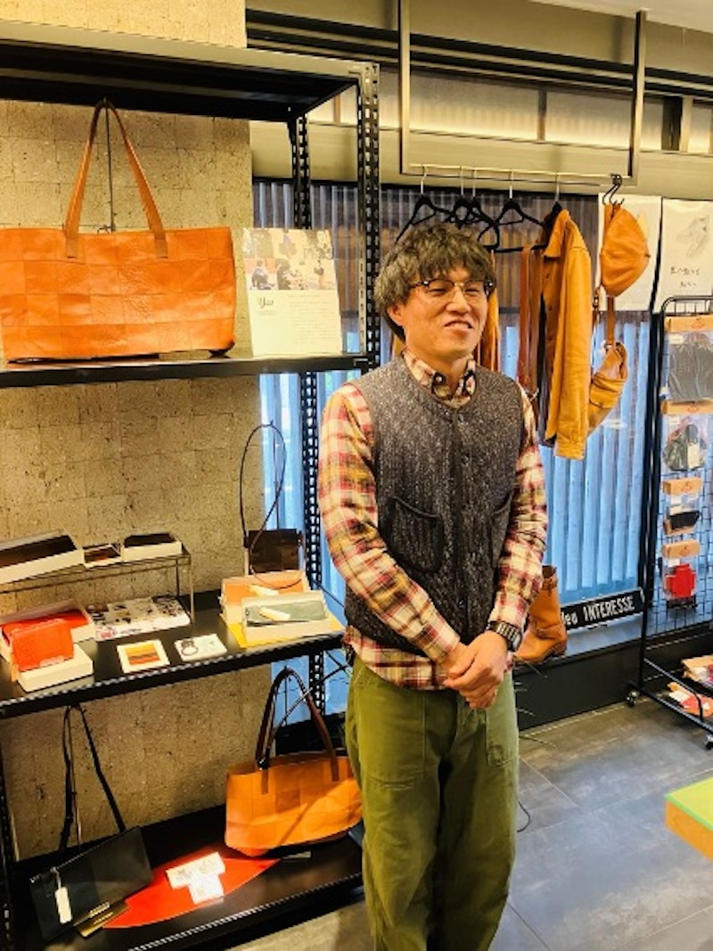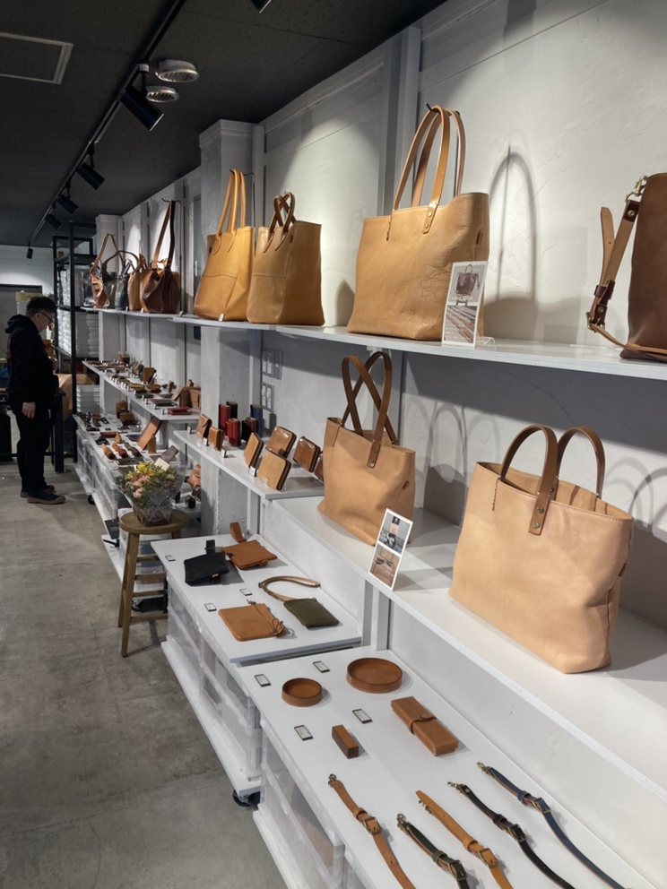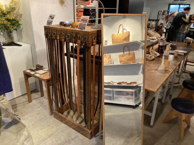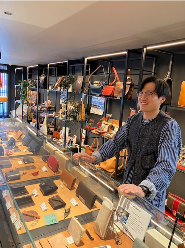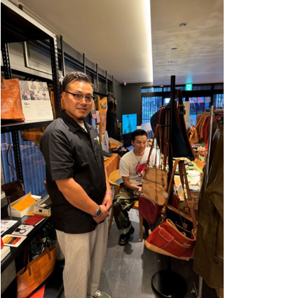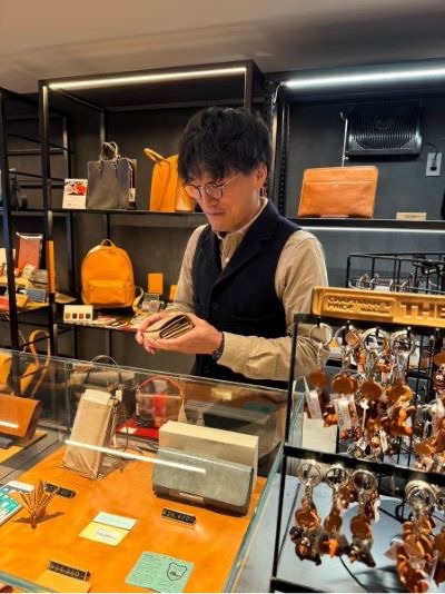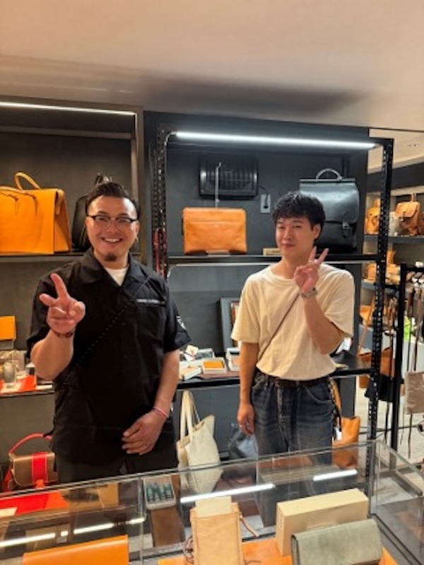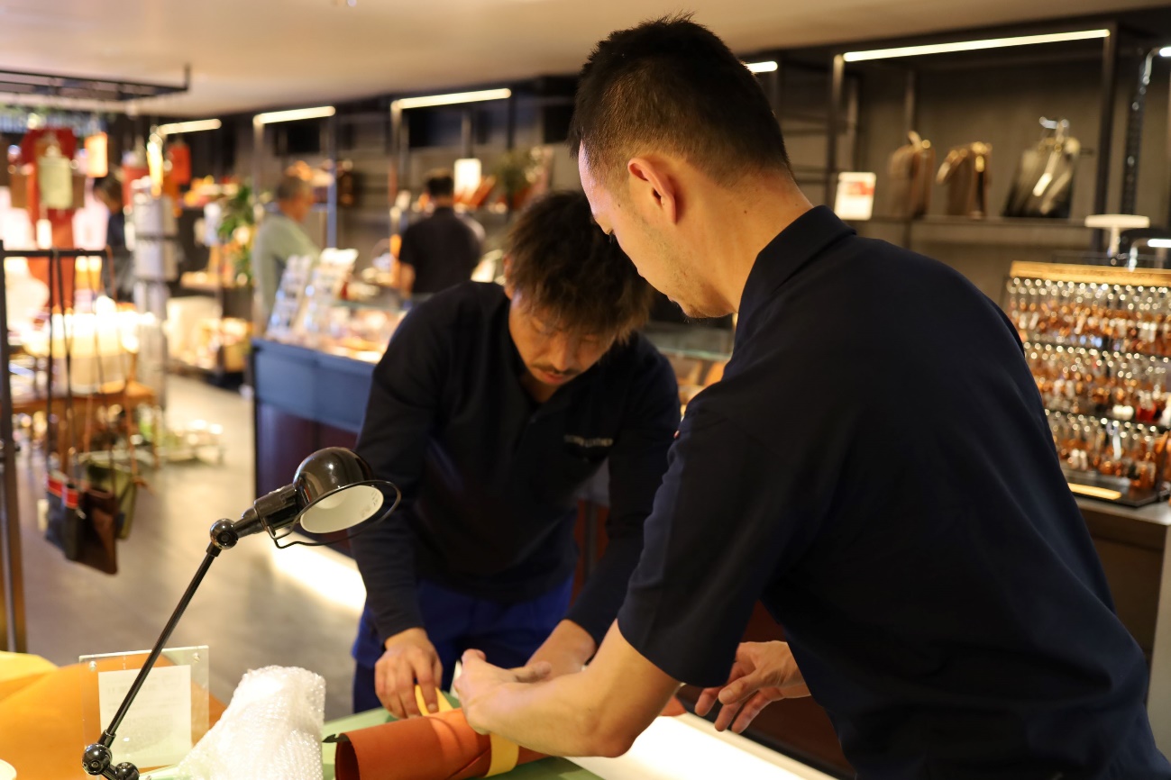商品の説明から革の特徴まで、実際革作りに携わっているからこその言葉で伝えていくことができますね。この日は同じ課の上野山さんもお店に遊びに来てくれました!
